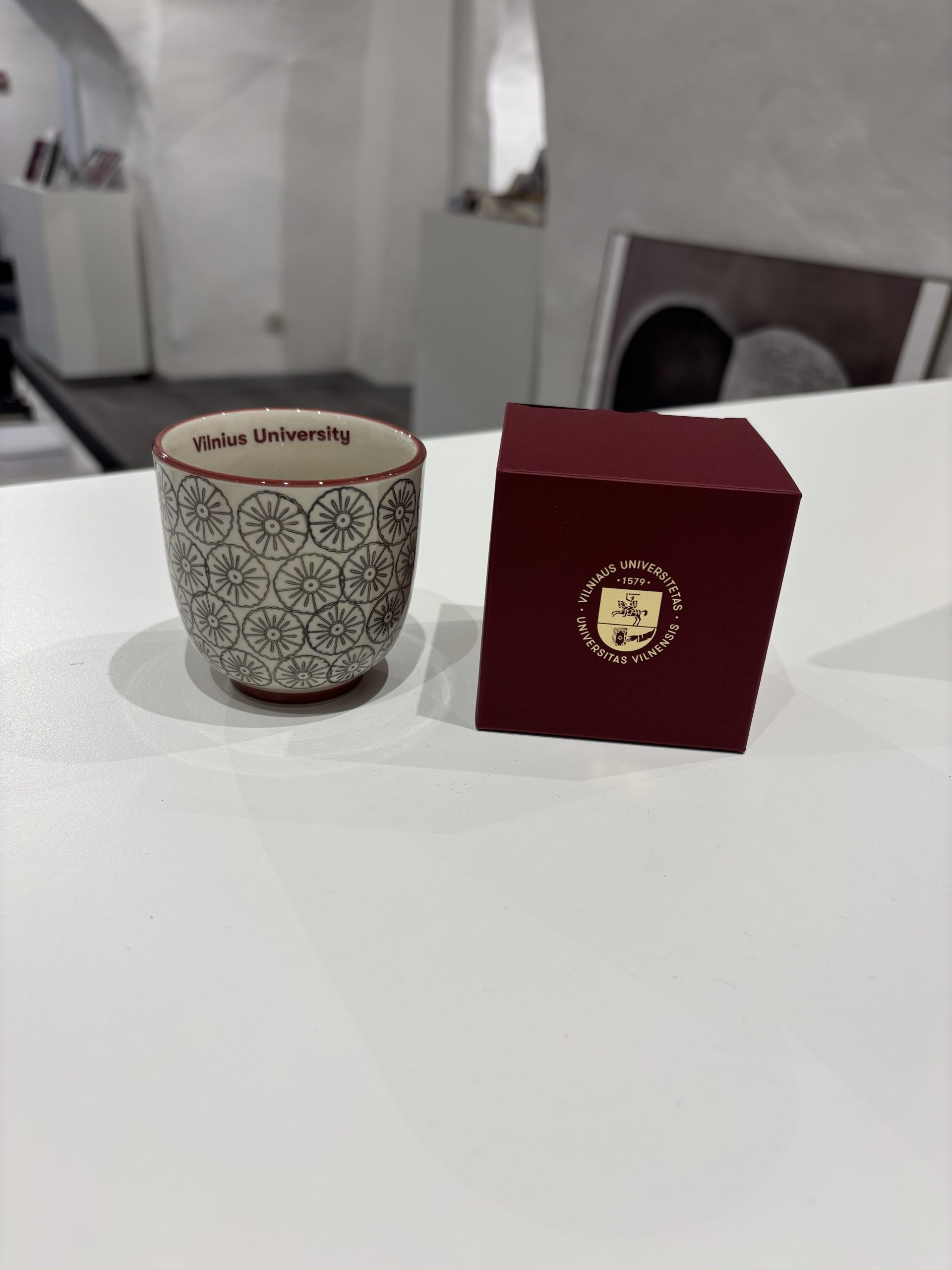 Each cup is packed in a separate burgundy box, decorated with the logo of Vilnius University;