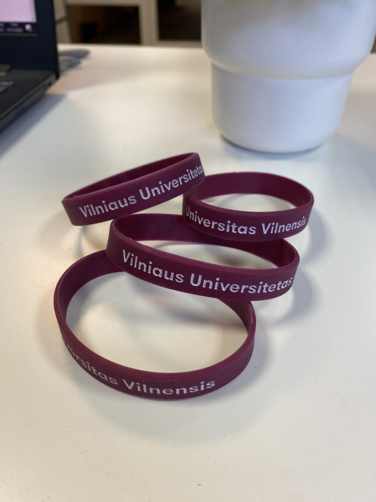 Silikoninė apyrankė su įspaustu lietuvišku ir lotynišku Vilniaus universiteto užrašu.